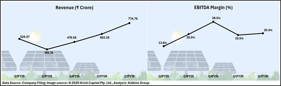 For the quarter ended September 2025, Waaree Renewable Technologies Ltd reported a strong financial performance, supported by robust project execution and improved operational efficiency. Revenue from operations surged 47.7% year-on-year (YoY) to ₹774.78 crore, compared to ₹524.47 crore in Q2FY25. Net profit more than doubled, rising 117.4% YoY to ₹116.34 crore, from ₹53.52 crore in the same period last year.