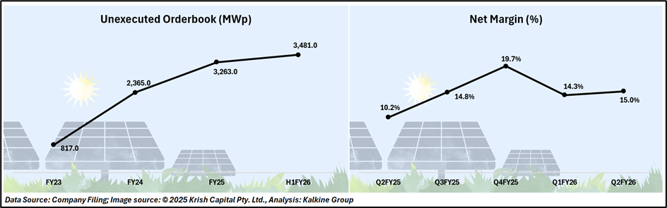 For the first half of FY26, Waaree Renewable maintained its strong growth trajectory, with revenue increasing 81.1% YoY to ₹1,377.97 crore, and profit after tax (PAT) surging 148% to ₹202.73 crore. The PAT margin improved to 14.7%, underscoring enhanced cost efficiencies, operating leverage, and scale benefits across its renewable energy projects.
