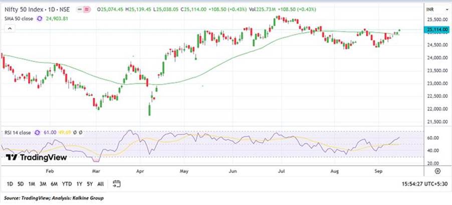 Index Update: The Nifty 50 rose 108.50 points to close at 25,114.00, reclaiming the 25,000 mark and improving sentiment. The index stayed above both the 21-day and 50-day SMAs, with the latter offering crucial support. Momentum is likely to strengthen if the index moves past 25,200, while 24,350.70 remains the critical support level along the falling trendline, which would help avoid deeper corrections.