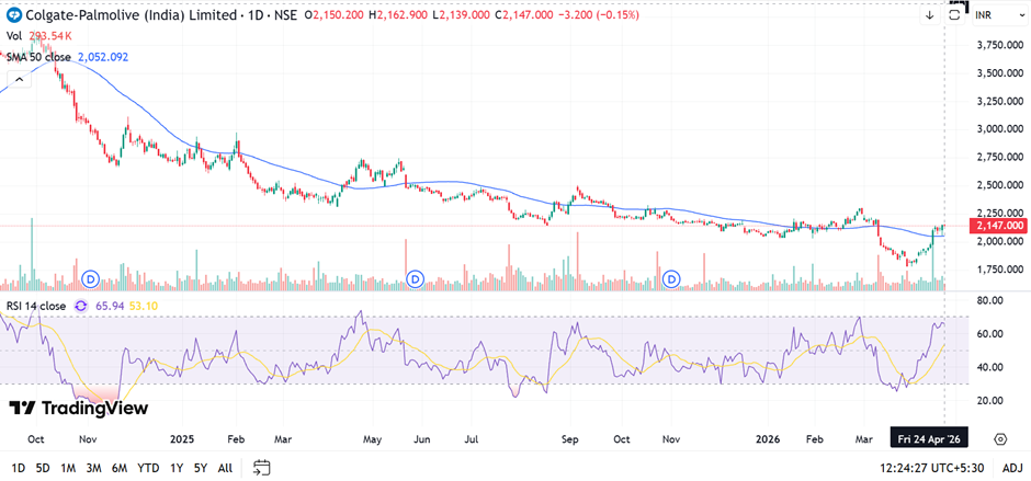 Colgate-Palmolive (India) Limited is showing early recovery signs after rebounding from recent lows near ₹1,950, with price approaching the 50-day SMA around ₹2,052. RSI near 65 indicates improving momentum. Immediate resistance is placed at ₹2,180–₹2,200, while support is seen near ₹2,050–₹2,080 for near-term stability.