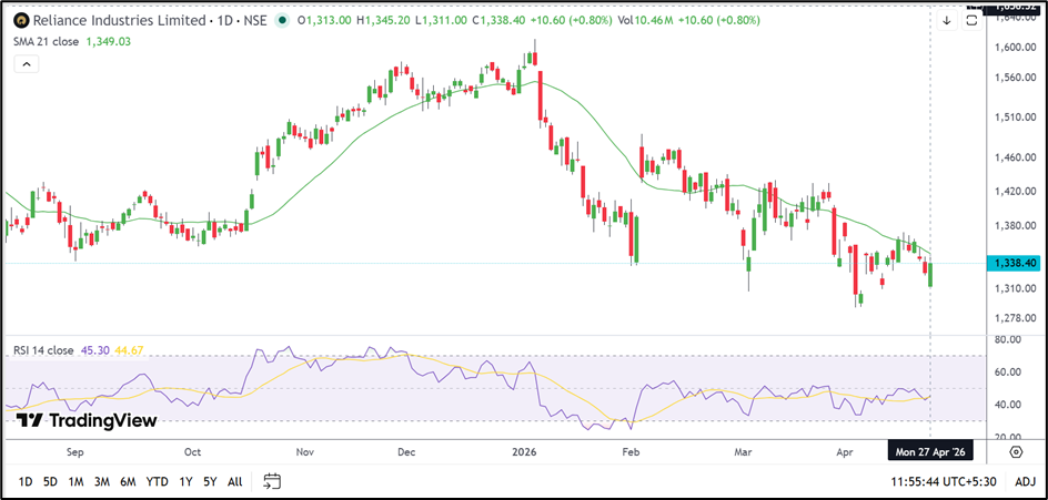 Reliance Industries Limited (NSE: RELIANCE) is currently trading near ₹1,338.60, slightly below its 21-day Simple Moving Average near ₹1,349.03. The stock has been forming a lower high structure since January, indicating a mild downtrend.