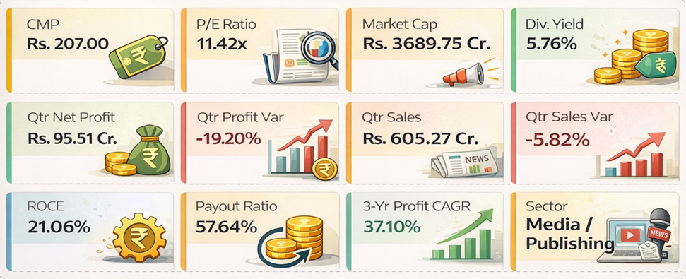 The quarterly revenue and profit declines reflect post-election base effects — election years generate elevated government and political advertising that normalises in subsequent periods. The underlying business is healthy, as evidenced by the 37.10% three-year profit CAGR and 21.06% ROCE. The P/E of 11.42x appears undervalued for this earnings trajectory.