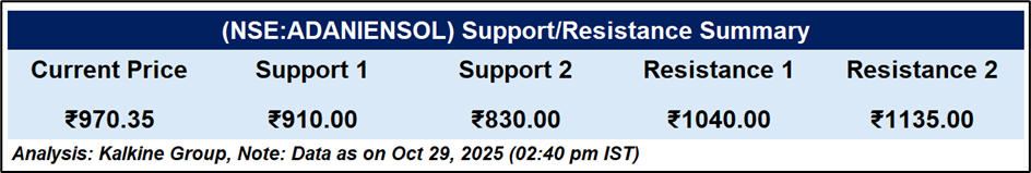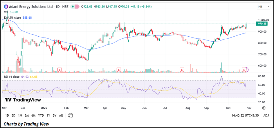Adani Energy Solutions Ltd surged 5.34%, trading at ₹970.35, continuing its recent upward momentum. The stock remains comfortably above the 51-day EMA (₹888.68), reinforcing bullish sentiment. The RSI at 64.9 reflects healthy momentum without overbought pressure, indicating room for further gains while maintaining near-term support around ₹900.