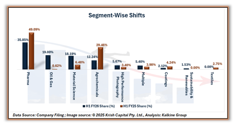 Pharma, historically the largest segment, contributed 35.85% of revenue in H1 FY26, down from 49.09% in H1 FY25. Notably, Oil & Gas and Material Science showed significant growth, contributing 19% and 18.19% respectively. Agrochemicals’ share reduced to 12.24%, while Sustainability & Renewables emerged as a new segment with 1.53% contribution. High Performance Photography, Coatings, and Multiple segments further underscore the company’s expanding product portfolio and strategic diversification.