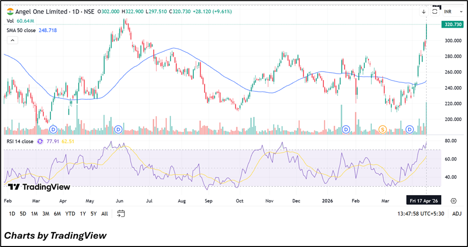 Shares of Angel One Limited (NSE:ANGELONE) recorded a notable upward movement following the earnings announcement, opening near INR 302.00 and touching a high of INR 322.90 during the session. The stock has moved above its 50-day Simple Moving Average, indicating improved near-term momentum, while the RSI near 78 signals elevated strength with potential near-term overbought conditions. Immediate support is placed at INR 300–305, whereas resistance is expected around INR 330–335 levels.