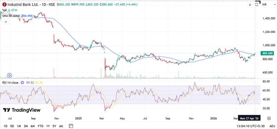 IndusInd Bank shows signs of recovery after rebounding from the 780–800 support zone and reclaiming levels near its 50-day SMA around 866. Price is trading near 885.60 with RSI at 59, indicating strengthening momentum. Immediate resistance is placed at 920–950, while support is seen in the 840–860 region.