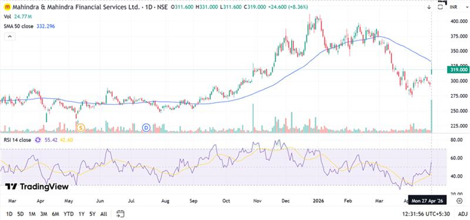 Shares of Mahindra & Mahindra Financial Services Limited (NSE:M&MFIN) rallied more than 8% in intraday trade, reflecting strong investor confidence after the company reported robust Q4FY26 and FY26 financial performance supported by improved profitability, digital transformation, and stable asset quality.