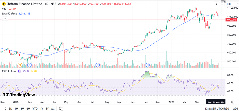 Shriram Finance is witnessing renewed selling pressure after slipping below its 50-day SMA near 1,011, indicating short-term weakness. Price has declined toward 970.25, while RSI near 45 reflects fading momentum. Immediate support is placed at 940–950, whereas resistance is seen around 1,000–1,015, suggesting a cautious near-term outlook.