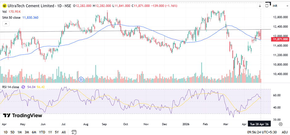 UltraTech Cement trades near ₹11,871, hovering around its 50-day SMA near ₹11,830, indicating consolidation after recovery. RSI near 54 signals neutral-to-positive momentum. Immediate resistance lies near ₹12,300–₹12,400, while support is visible around ₹11,600. Sustained breakout above resistance could confirm continuation of the medium-term uptrend.
