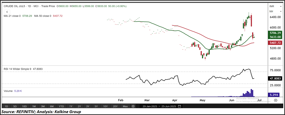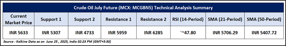 Crude Oil MCX July contract is currently trading around ₹5,633, recovering 0.90% after a sharp pullback from recent highs above ₹6,400. The price is holding above the 50-day SMA at ₹5,407.72 while facing immediate resistance near the 21-day SMA at ₹5,706.29. The 14-day RSI stands at 47.80, indicating neutral momentum and ongoing consolidation. For traders, sustaining above ₹5,959 keeps the short-term outlook stable, while a breakout above ₹5,959 could trigger a fresh upside toward ₹6,285. On the downside, a break below ₹5,307 may invite further weakness. Until then, dips toward support may offer favourable buying opportunities.