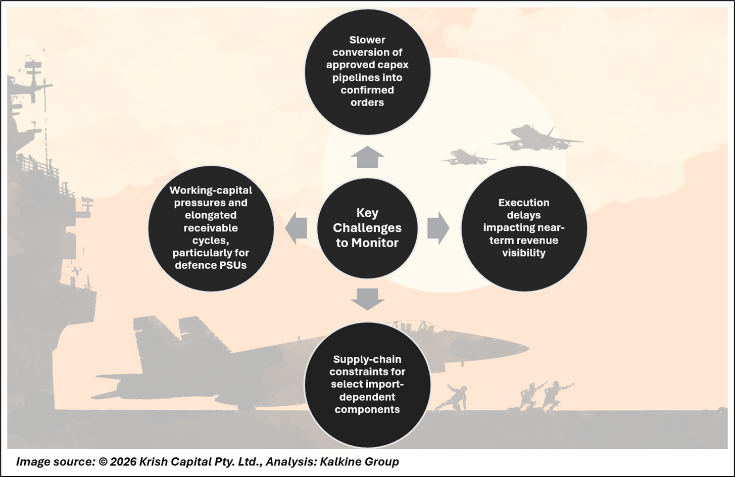 The defence sector’s outlook remains structurally positive but increasingly execution driven. Elevated order books, near-peak execution levels, and long-term visibility from modernisation, indigenisation, and exports provide support. However, returns are likely to be more selective, favouring companies with disciplined execution, manageable working capital, and clear earnings visibility.