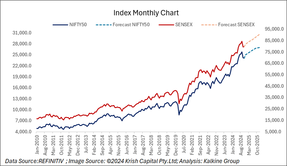 The NIFTY50 index of the Indian stock market reached an all-time high of 26,277.35, while the BSE Sensex hit a record of ₹85,978.25 on 27th September 2024. After reaching these all-time highs, the market trend appears to be shifting, with a bearish phase potentially ahead. The Nifty50 breached strong support levels of ₹24,800 and ₹24,500, falling to a low of ₹23,263.15, while the BSE Sensex dropped to ₹76,802.73 on 21st November 2024.