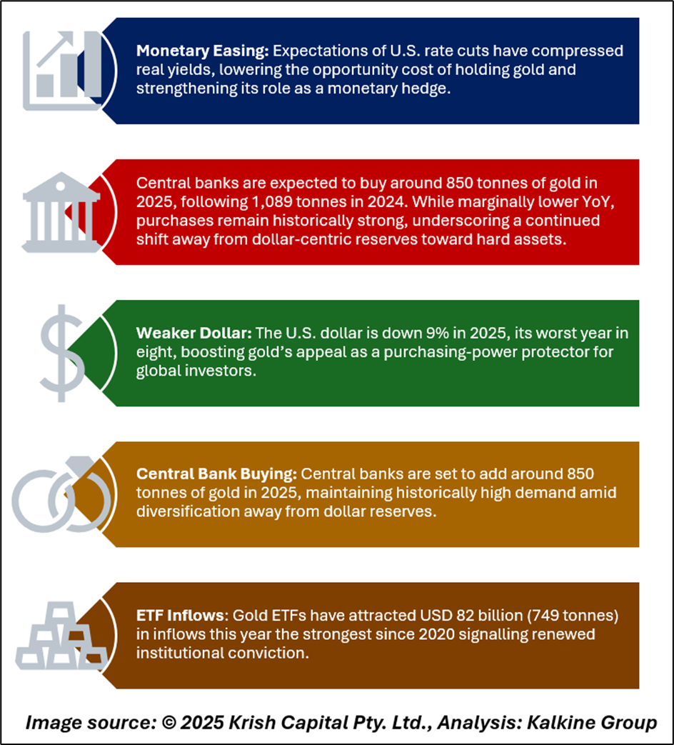 For perspective, gold’s best-known rally occurred in 1979, when prices jumped from USD 226 per ounce in December 1978 to USD 512 per ounce in December 1979, a 126.55% YoY gain during a period marked by inflation shocks and monetary instability. While the current rally is less extreme numerically, it is arguably more durable, as it is supported by broader institutional participation and long-term reserve diversification.