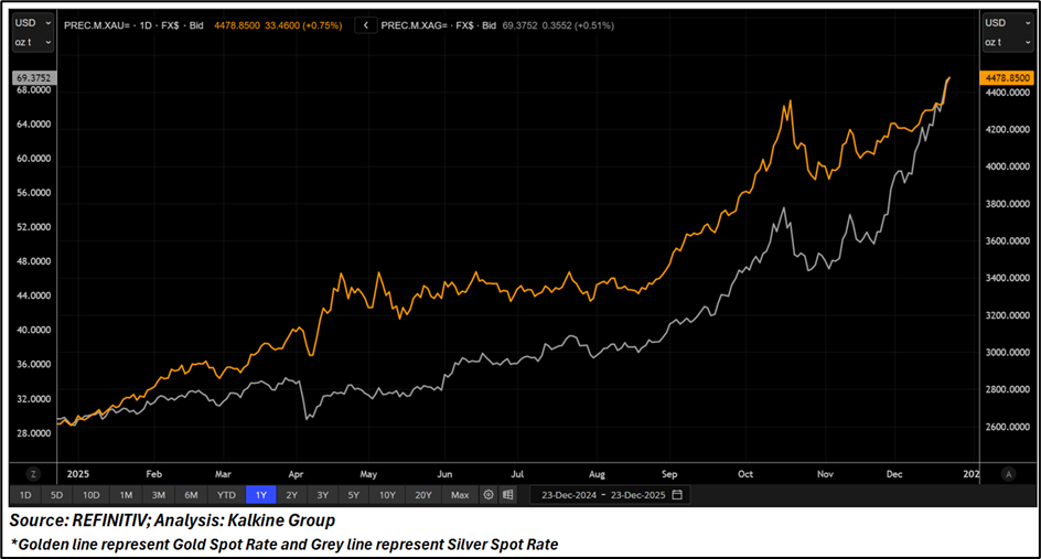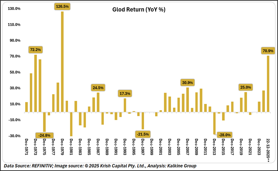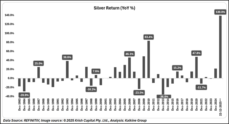 Gold’s rally has been relentless and historically significant. From USD 2,623.81 per ounce in December 2024 to USD 4,483.69 per ounce by 22 December 2025, gold has delivered an extraordinary 70.88% YoY return, placing it among the strongest annual performances in its recorded history.