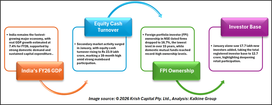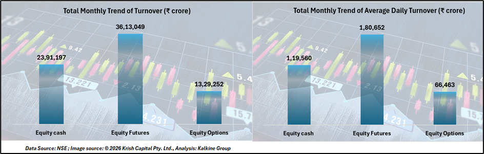 While primary market fundraising moderated in January, secondary market participation strengthened significantly. Equity cash turnover climbed to Rs 23.9 lakh crore, marking a 16-month high. Derivatives activity also intensified, particularly in index options, with Nifty contracts dominating turnover.