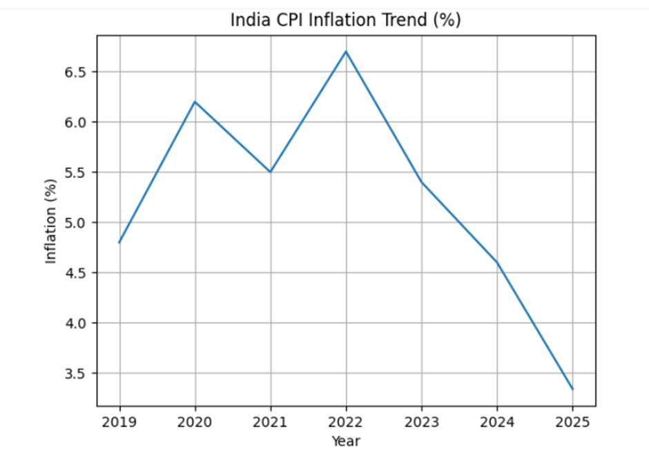 A key starting point is inflation dynamics. India’s consumer price inflation has moderated significantly, declining to approximately 3.34% year-on-year in March 2025. This places inflation comfortably within the Reserve Bank of India’s target band of 2–6%, with a medium-term target of 4%. The trajectory of inflation over recent years highlights both the volatility induced by global shocks and the subsequent stabilisation driven by domestic policy.