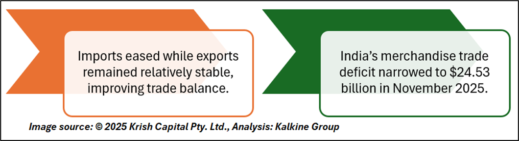 Merchandise exports during November were recorded at $38.13 billion, indicating resilience amid uncertain global demand conditions. While export growth remained moderate, the steady performance ensured that the contraction in the trade deficit was not undermined by a sharp fall in outward shipments. The export figures suggest that Indian manufacturers and exporters were able to maintain overseas demand despite external headwinds.