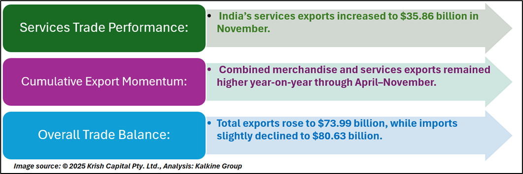 India’s services sector continued to act as a stabilising force for the external account. Services exports rose from $32.11 billion to $35.86 billion in November, highlighting sustained global demand for Indian services. Meanwhile, services imports edged up marginally to $17.96 billion, keeping the services trade surplus intact and helping offset part of the merchandise trade gap.