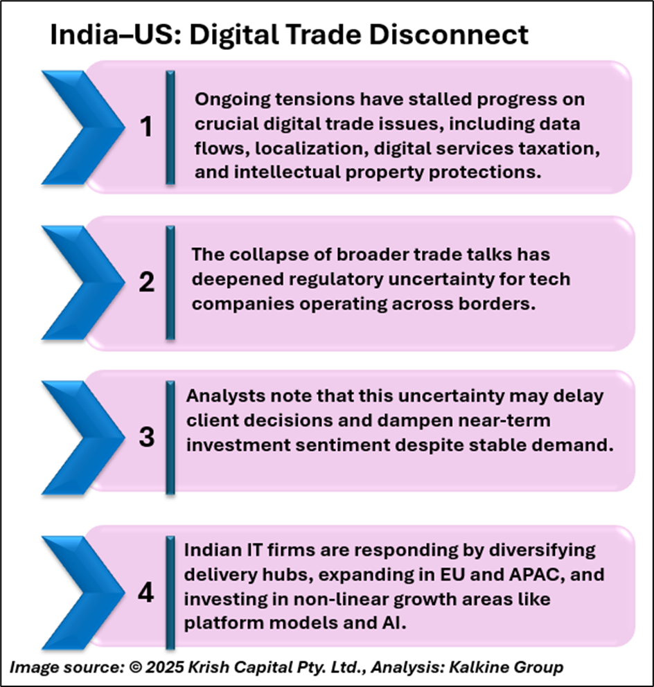 India and the US have long engaged in sporadic negotiations over digital trade norms covering cross-border data flows, localisation, digital taxation, and intellectual property. The collapse of broader trade talks has stalled progress, leaving tech companies in regulatory limbo. This uncertainty may prompt multinationals to rethink outsourcing and data centre expansion plans in India. “IT and ITeS companies thrive on predictability unclear rules of digital engagement across borders hurt confidence and investment,” an analyst observed.