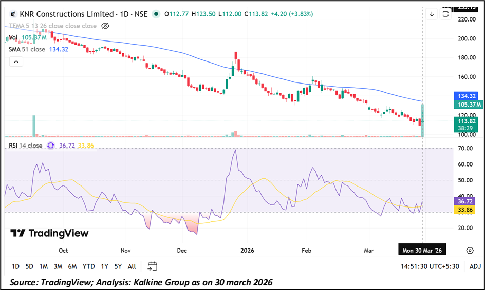 KNR is trading below all major moving averages (20/50/100/200 DMA) indicating a strong downtrend. The stock has witnessed a steep ~50–55% correction from highs (~₹247) and trend across timeframes looks bearish.