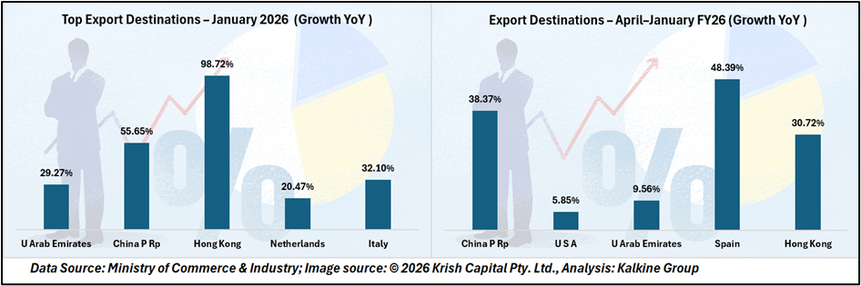 Among export destinations showing notable growth in January 2026 were the United Arab Emirates, China, Hong Kong, Netherlands, and Italy. Over the April–January period, exports to China, the United States, the United Arab Emirates, Spain, and Hong Kong recorded positive growth.
