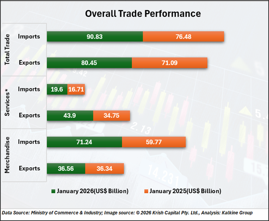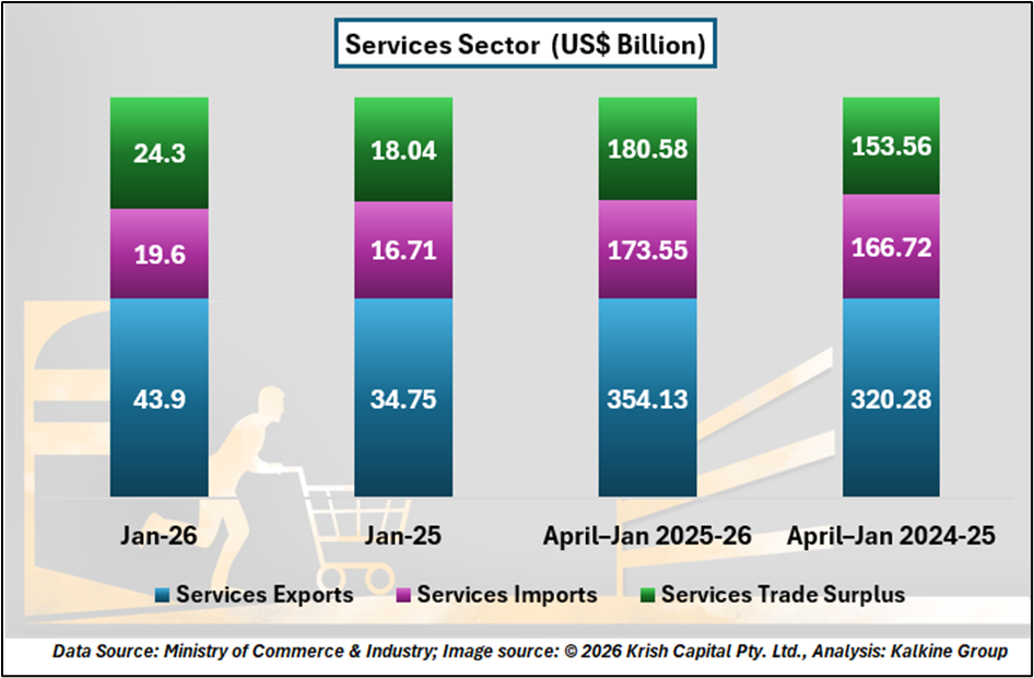 India’s services sector remained a major pillar of trade growth. Services exports for January 2026 are estimated at US$ 43.90 billion, compared to US$ 34.75 billion in January 2025, reflecting strong year-on-year expansion. Services imports during the month stood at US$ 19.60 billion, up from US$ 16.71 billion.
