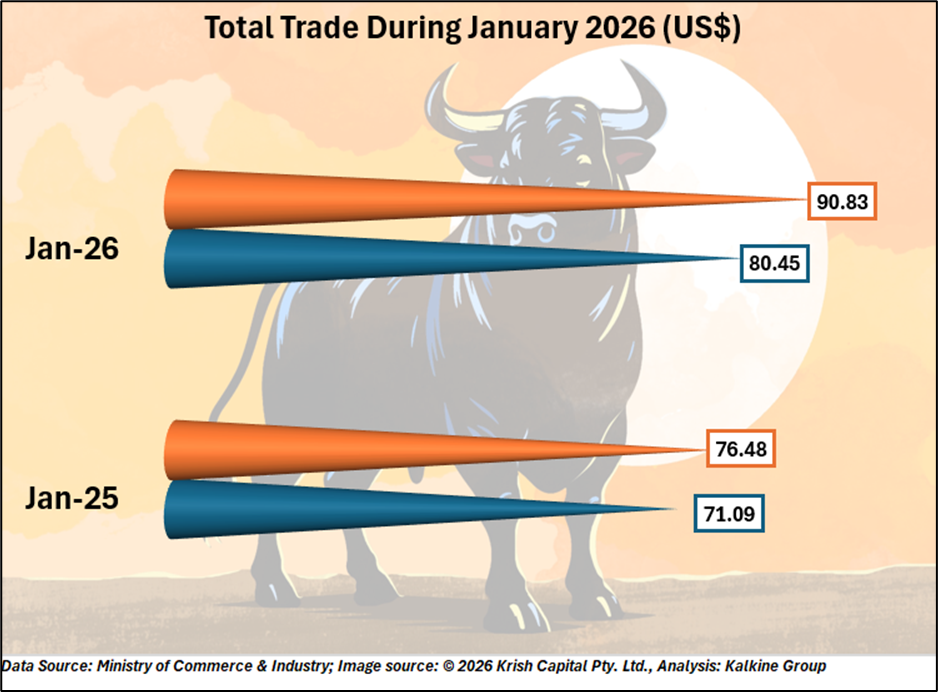 In January 2026, India’s total exports (merchandise and services combined) are estimated at US$ 80.45 billion, registering a robust year-on-year growth of 13.17% compared to US$ 71.09 billion in January 2025. Imports during the month rose more sharply by 18.76% to US$ 90.83 billion, up from US$ 76.48 billion a year earlier.