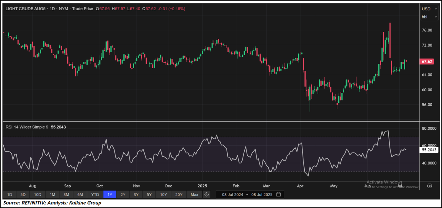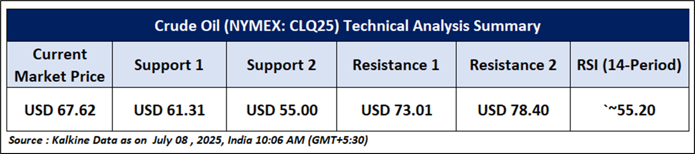 Light Crude August futures are showing signs of short-term consolidation after a sharp rally in late June. Despite the recent pullback, the price continues to trade above key support near $64, maintaining its higher-low structure. The RSI (14) stands at 55.20, easing from overbought territory but still indicating underlying bullish strength. The recent surge in momentum, followed by a healthy cooldown, suggests potential for another leg higher if support holds. A break above $73.01 could revive upward momentum, while a dip below $61.31 may invite further profit booking. Overall trend remains cautiously bullish above support.