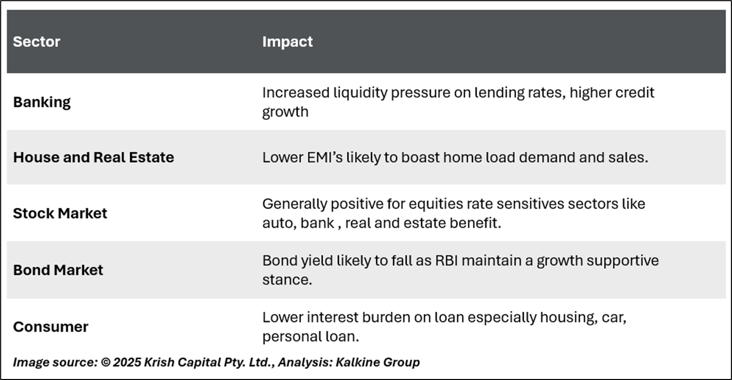 Reviving Credit Growth in FY26: India Ratings and Research (Ind-Ra) anticipates that these policy measures will help revive bank credit growth, which had declined to 9.9% in April 2025. With lower borrowing costs and improved liquidity conditions, Ind-Ra forecasts a rebound in credit growth to between 13% and 13.5% in FY26. Sectors likely to benefit include housing, real estate, and small businesses, where demand had weakened due to high lending rates and tighter liquidity. While lending to non-banking financial companies (NBFCs) and the retail sector may moderate, the RBI's actions are set to support private capital expenditure a key driver of sustainable growth.