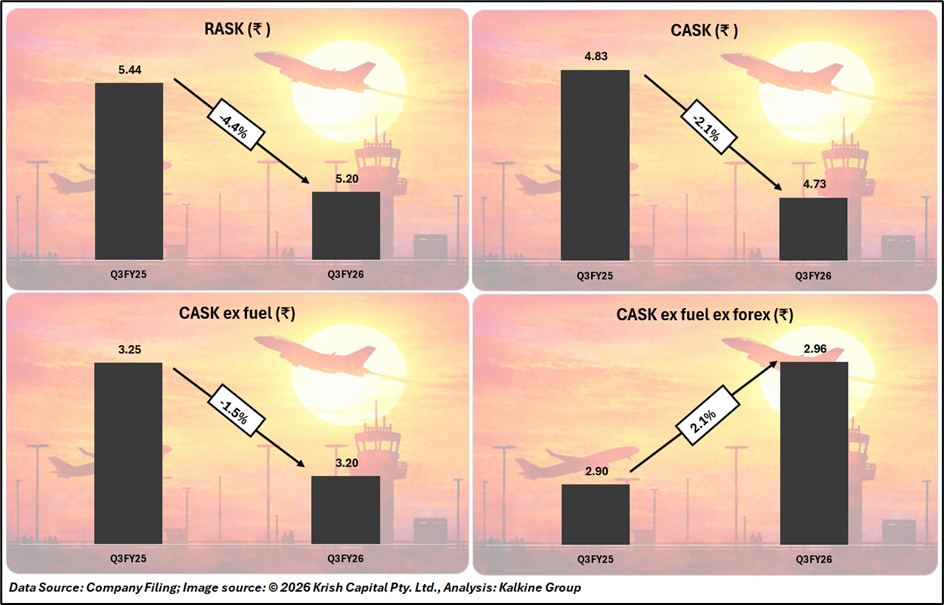 Cost discipline continued to underpin operating performance. CASK declined 2.1% YoY to ₹4.73, aided by favourable fuel economics and fleet mix optimisation, although CASK ex-fuel ex-forex increased 2.1% YoY due to contractual escalations, currency depreciation, and modest dilution in operating leverage. EBITDAR stood at ₹60.1 billion, with margins of 30.0% excluding forex, reinforcing the strength of IndiGo’s operating model.