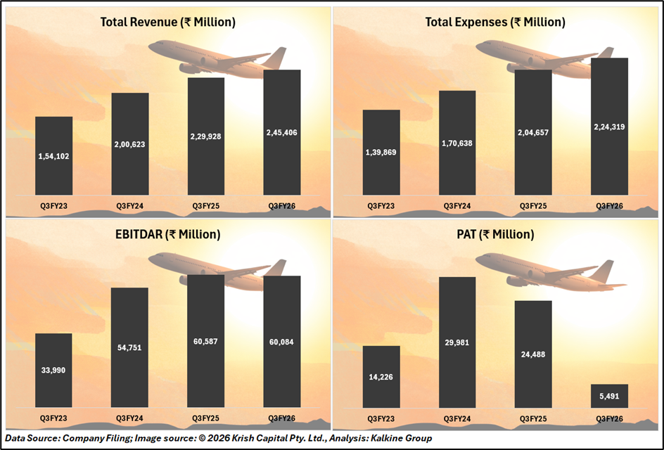 IndiGo delivered a mixed performance in Q3 FY26, with reported profitability materially affected by exceptional items and currency headwinds. Total income for the quarter increased 6.7% year-on-year to ₹245.4 billion, supported by an 11.2% expansion in capacity and robust passenger demand during the festive and wedding season. Passenger volumes rose to 31.9 million, although revenue quality moderated, with RASK declining 4.4% YoY and yields easing 1.8% YoY, reflecting competitive intensity and capacity optimisation following early-December operational disruptions.