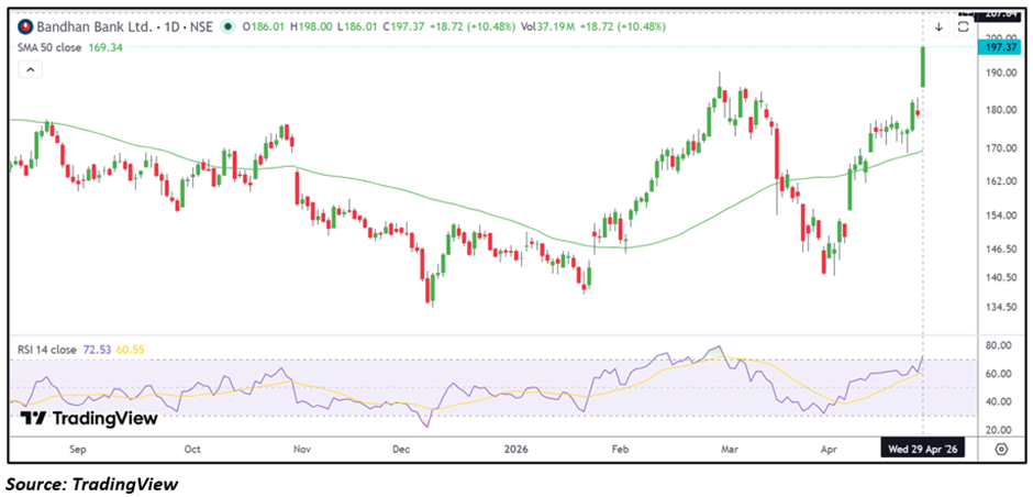 Bandhan Bank Limited (NSE: BANDHANBNK) surged sharply to ₹197.37 on April 29 after opening at ₹186.01 and touching an intraday high of ₹198.00. The stock rallied strongly following the announcement of its Q4 FY26 results.
