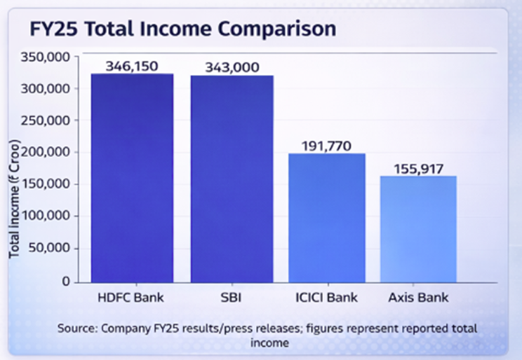 HDFC Bank (NSE:HDFC) and SBI (NSE:SBI) continue to dominate in terms of total income, reflecting their massive balance sheets and extensive lending franchises. ICICI Bank (NSE:ICICIBANK) and Axis Bank (NSE: AXISBANK) follow at a considerable distance, while Kotak Mahindra Bank (NSE:KOTAKBANK) remains relatively smaller but more focused.