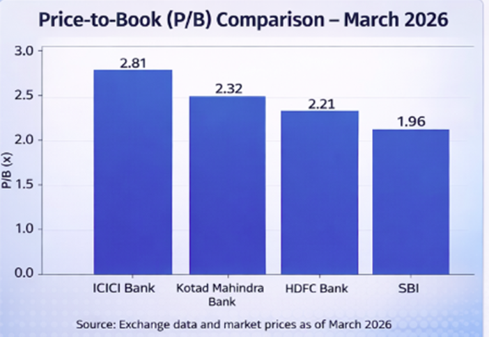 ICICI Bank now commands the highest P/B multiple among peers, followed by Kotak Mahindra Bank. HDFC Bank, once the sector’s premium stock, now trades below both.