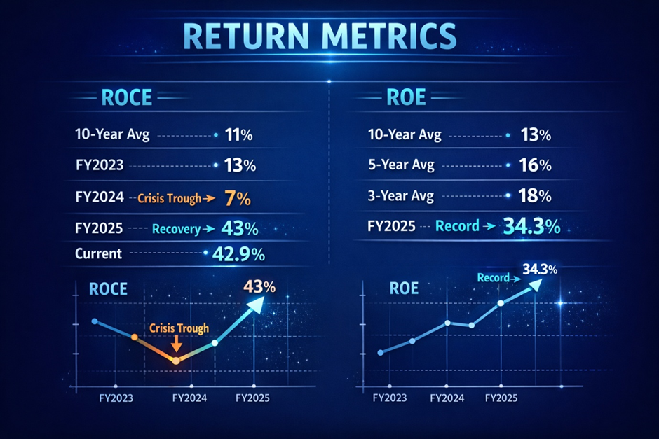 The return on capital employed of 42.9% and ROE of 34.3% represent the strongest capital efficiency metrics in MCX's listed history. These are not merely recovery numbers — they are genuinely exceptional returns for any regulated financial infrastructure business globally. For context, the London Stock Exchange Group and Intercontinental Exchange (ICE) — among the world's most profitable exchange operators — typically deliver ROCEs in the 15–25% range. MCX's 42.9% ROCE reflects the extraordinary economics of near-monopoly exchange operation in a rapidly growing derivatives market.