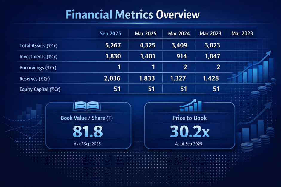 The balance sheet profile is that of an exceptionally capital-light, financially pristine business. Borrowings of just ₹1 Cr against total assets of ₹5,267 Cr represents a debt-to-asset ratio of 0.02% — effectively zero.