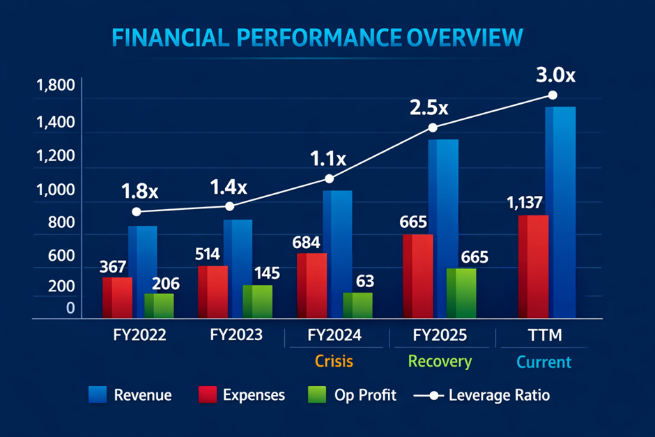 This is precisely what the FY2024-to-FY2025 recovery illustrates. The technology crisis of FY2024 artificially inflated the expense base — ₹621 Cr of expenses against ₹684 Cr of revenue left only ₹63 Cr of operating profit. As technology costs normalised, the expense base dropped to ₹447 Cr in FY2025 even as revenue surged to ₹1,113 Cr — producing ₹665 Cr of operating profit. On a TTM basis, expenses of ₹567 Cr against revenue of ₹1,704 Cr deliver ₹1,137 Cr of operating profit. The fixed cost base has barely moved while revenue has more than doubled.
