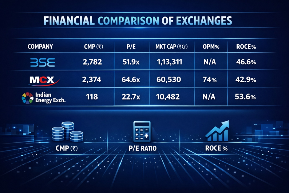 India's exchange sector is a concentrated oligopoly — just three listed exchange operators, each with near-monopoly positions in their respective market segments. BSE dominates equity settlement infrastructure, IEX dominates electricity derivatives, and MCX dominates commodity derivatives.