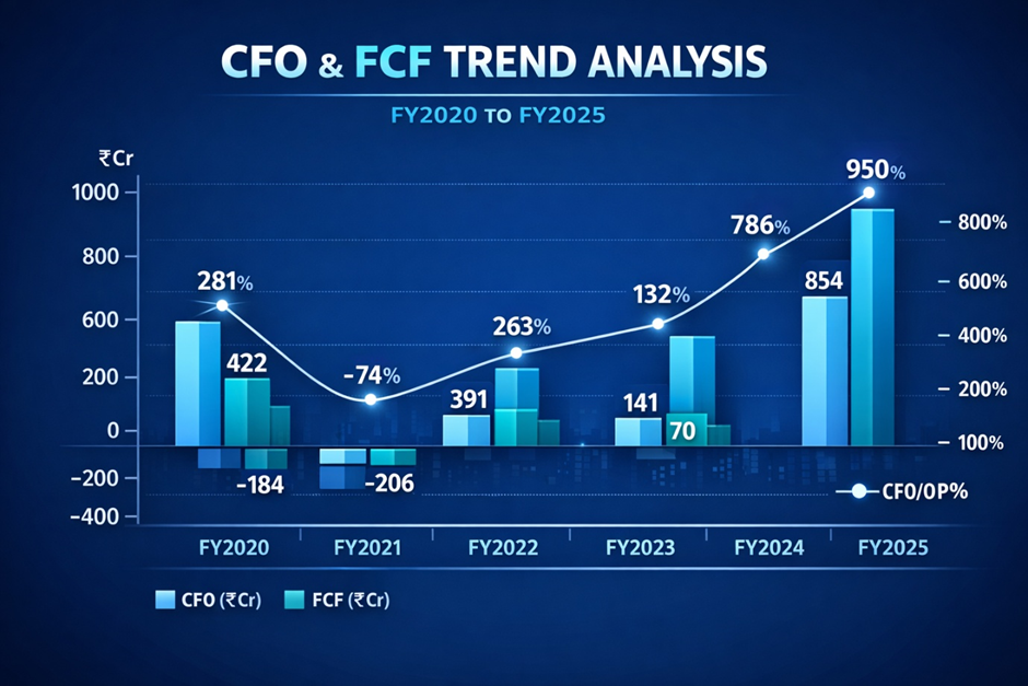 Cash from operations of ₹950 Cr in FY2025 against net profit of ₹560 Cr — a CFO/Net Profit ratio of 170% — confirms exceptional earnings quality. The business is generating significantly more cash than its reported profits, reflecting the float income from client margin deposits and the timing of fee collections. Free cash flow of ₹854 Cr in FY2025 is the highest in the company's history and provides substantial capital for dividends, investments, and potential new product development.