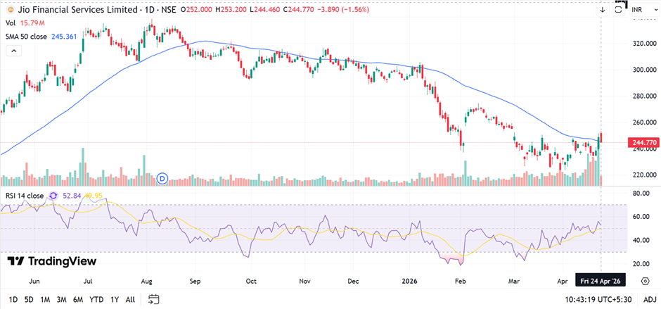 Jio Financial Services Limited is attempting a short-term recovery near ₹245 after a prolonged downtrend, with price hovering around the 50-day SMA near ₹245. RSI near 52 indicates improving momentum. Immediate support is seen at ₹238–₹240, while sustained strength above ₹250–₹255 could signal further upside recovery in the near term.