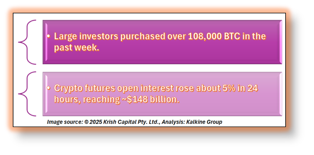 Large investors, often called “whales,” have increased their accumulation, with over 108,000 BTC reportedly purchased in the past week. Open interest in crypto futures rose approximately 5% in 24 hours to around $148 billion, indicating heightened market participation and leverage. Analysts believe that current support levels present an attractive accumulation opportunity.