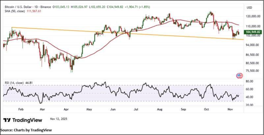 BTC is currently trading above a key falling trendline support near USD 98,600, a historically important level that has repeatedly contained downside movements. The overall price structure maintains a cautiously positive bias, supported by sustained upward momentum. Momentum indicators reflect this outlook, with the 14-period RSI at 44.81, suggesting that while bullish momentum is present, it remains moderate with room for further improvement. However, BTC continues to trade below its 50-period Simple Moving Average (SMA), which serves as dynamic resistance and may limit near-term gains. The MACD histogram remains below the zero line, indicating that bearish momentum persists, while the Parabolic SAR is positioned above the price, highlighting continued resistance and the potential for short-term downward pressure until a clearer bullish breakout emerges.