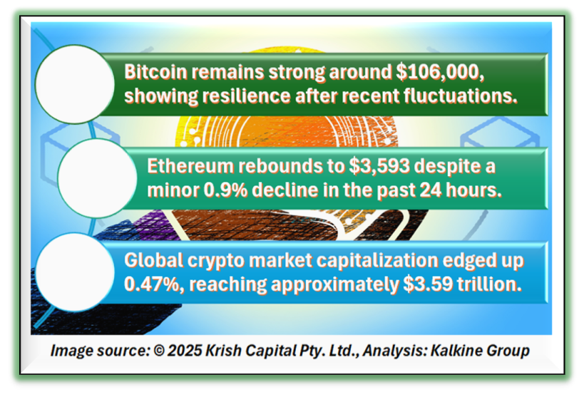 Bitcoin is trading around $106,000, showing resilience after slight fluctuations in recent sessions. Ethereum has reclaimed $3,593, although it saw a minor decline of 0.9% over the last 24 hours. Several altcoins, including XRP, Solana, Tron, Dogecoin, and Cardano, recorded gains of about 3%, while Binance Coin (BNB) and Hyperliquid experienced a drop of nearly 4%. Overall, the total global crypto market capitalization edged up by 0.47% to reach approximately $3.59 trillion.