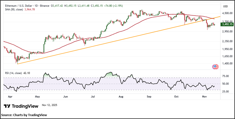ETH is currently trading below a key rising support level near USD 3,965.20, a historically significant zone that has repeatedly limited upward movements. The overall technical structure remains bearish, reflecting sustained downside momentum and a cautious market tone. Momentum indicators align with this view the 14-period RSI, at 42.10, indicates moderate weakness and suggests the potential for renewed selling pressure if bearish sentiment deepens. Furthermore, ETH continues to trade below its 50-period Simple Moving Average (SMA), which acts as a dynamic resistance and reinforces the prevailing short-term negative bias. The MACD histogram remains below the zero line, confirming ongoing bearish momentum, while the Parabolic SAR is positioned above the price, signaling continued resistance and the likelihood of persistent downward pressure in the near term.