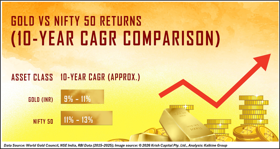 Gold and equities have delivered competitive long-term returns, with Nifty 50 marginally outperforming gold over the past decade. While equities remain linked to economic growth and earnings expansion, gold continues to serve as a diversification and risk-hedging asset. A balanced allocation across both asset classes may support portfolio stability over market cycles.