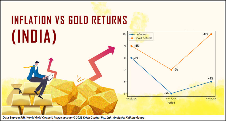 Gold returns in India have broadly tracked inflation trends across periods, reinforcing its role as a potential hedge against rising prices. Higher returns during 2020–2025 alongside elevated inflation highlight increased demand for safe-haven assets. This trend indicates that gold allocation may help preserve purchasing power during periods of sustained inflationary pressure.