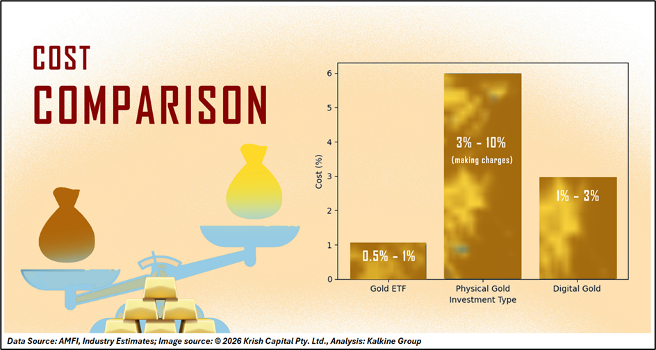 Investment costs vary significantly across gold formats, influencing overall returns. Gold ETFs generally offer lower expense ratios compared to physical gold, which includes making charges, and digital gold, which carries platform-related costs. Lower transaction and holding costs in ETFs may support efficiency, particularly for long-term investors seeking transparent and liquid exposure to gold.