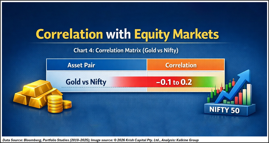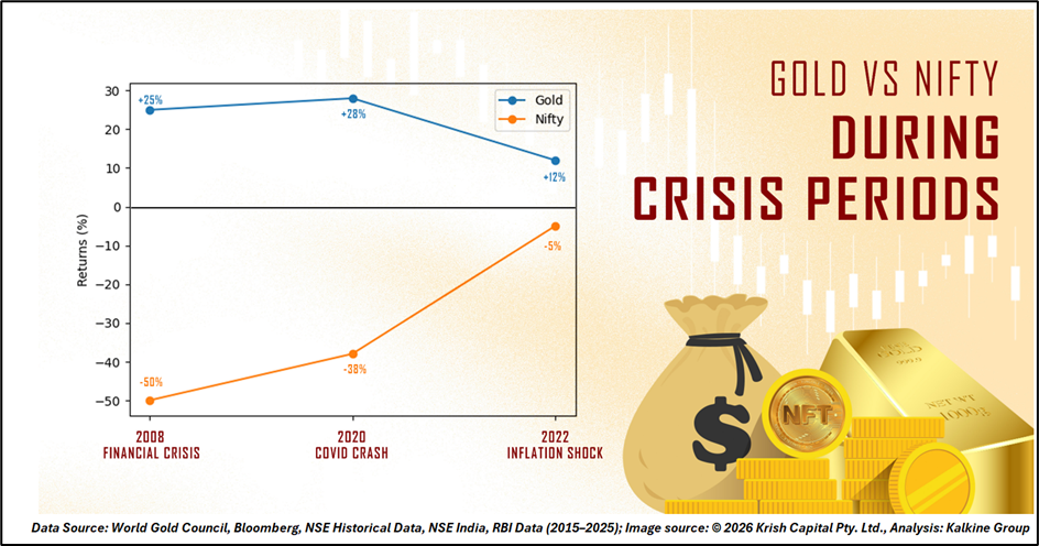 Historical crisis periods indicate gold often outperforms equities during market stress, acting as a defensive asset. In events such as the 2008 financial crisis and the 2020 pandemic-led decline, gold delivered positive returns while Nifty posted sharp losses. This trend highlights gold’s role as a hedge during periods of heightened volatility.