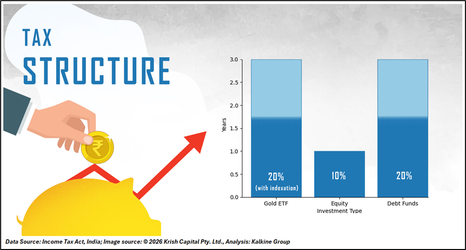 Tax treatment plays a significant role in post-tax investment returns across asset classes. Equity investments benefit from shorter holding periods and comparatively lower LTCG tax rates, while gold ETFs and debt funds require longer holding durations for tax efficiency. Investors often evaluate tax implications alongside returns when structuring diversified, long-term investment portfolios.