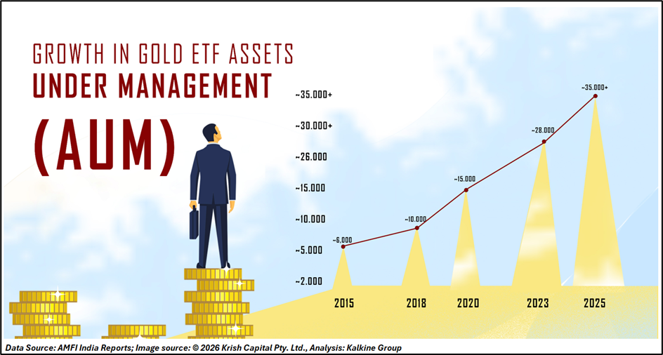 Gold ETF assets under management have shown steady expansion over the past decade, reflecting rising investor preference for digital and transparent gold investment avenues. The sharp increase after 2020 highlights heightened demand during uncertain periods. Continued growth in AUM indicates increasing institutional and retail participation, supporting gold’s role as a portfolio diversification asset.